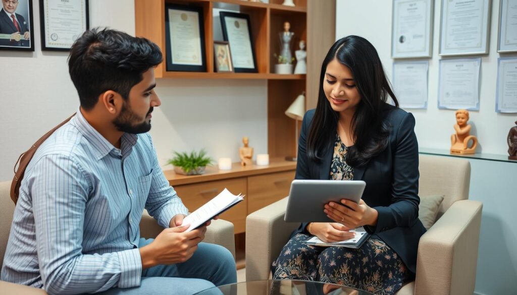 A couple reviewing surrogacy agency documents with a consultant in Mumbai